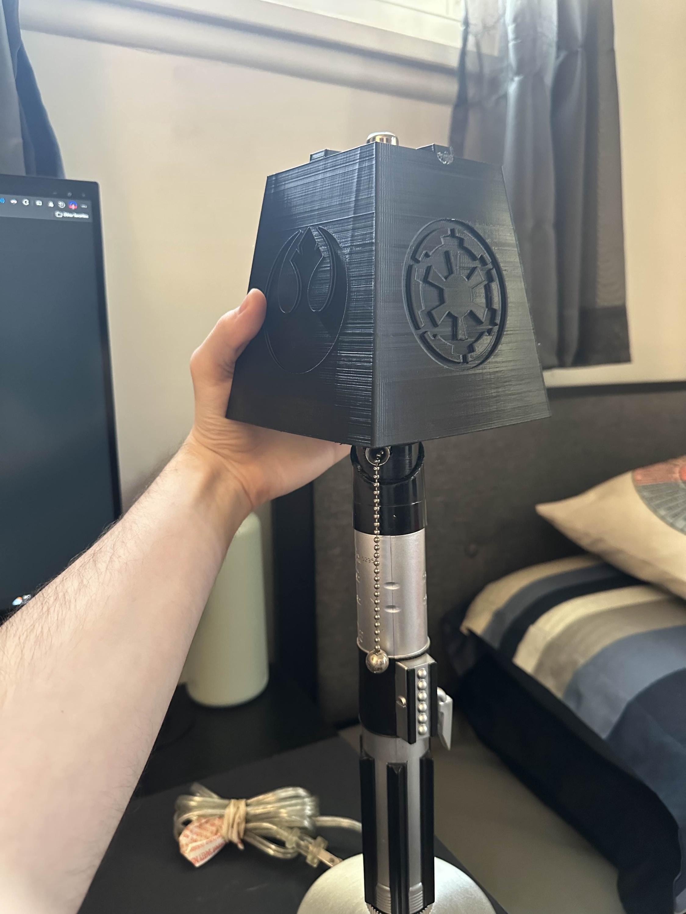 Very cool lamp shade for my very cool Litesaber lamp! I ordered the black 3d printed one. Quality of it is great. No marks, scratches, or dents. Only thing I can really notice is the glue towards the top, but its only on one of the sides. I ordered my lamp and lampshade without the bulb, so I was unable to take a picture of it fully together so I held it up to the lamp to give you an idea of what it might look like with yours. Shipping was very fast (ordered on a thursday, it arrived on monday) and was packaged very nicely. I would defintely recommend this lampshade to compliment your litesaber lamp :)