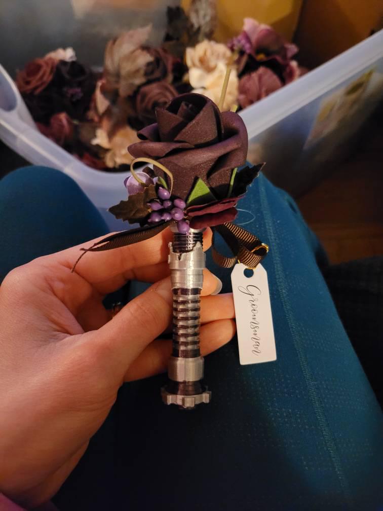 Unique way to decorate your wedding boutonniere, with a lightsaber.