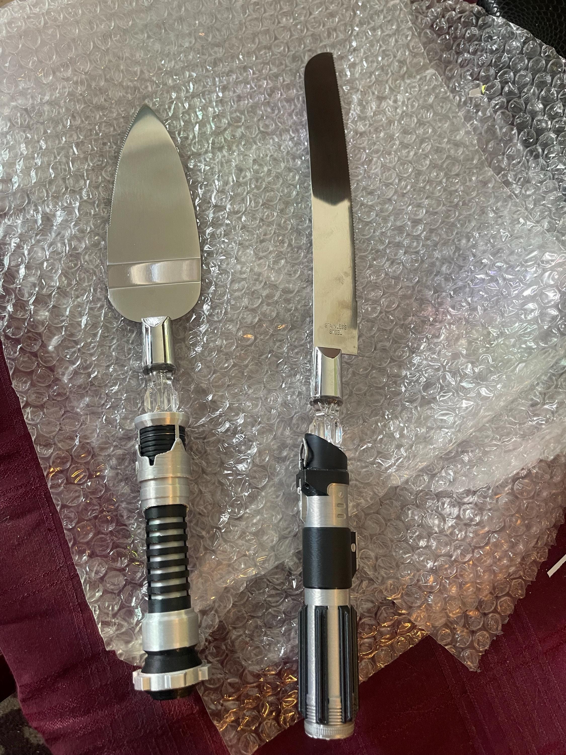 The lightsabers are 3D printed and hand painted , they may have minor scratches or blemishes. The wedding cake utensils set are new, they are hand assembled , packaged with care for you to show off at your wedding.