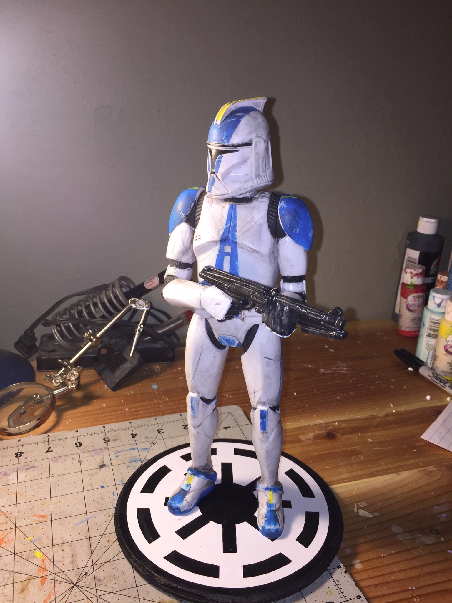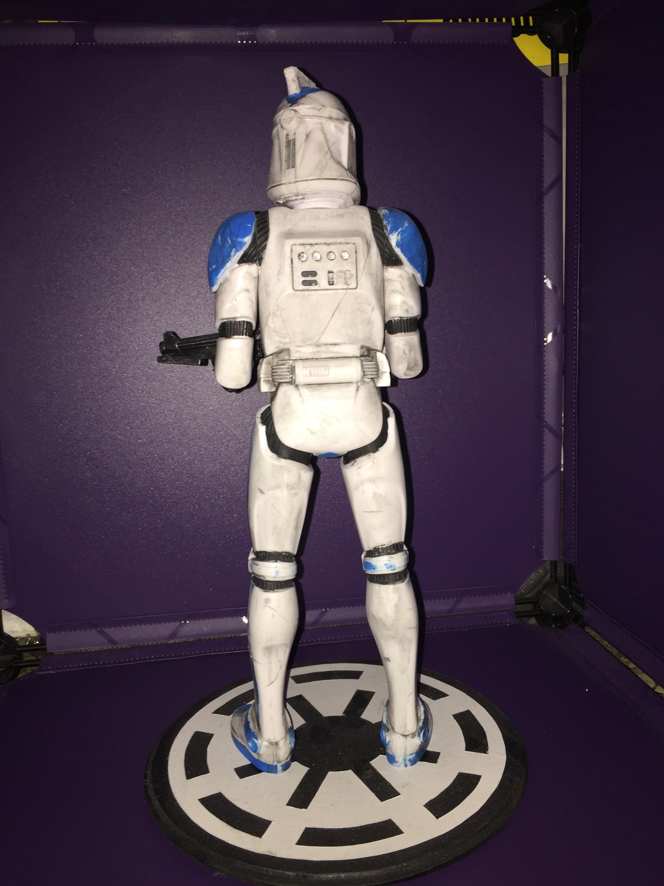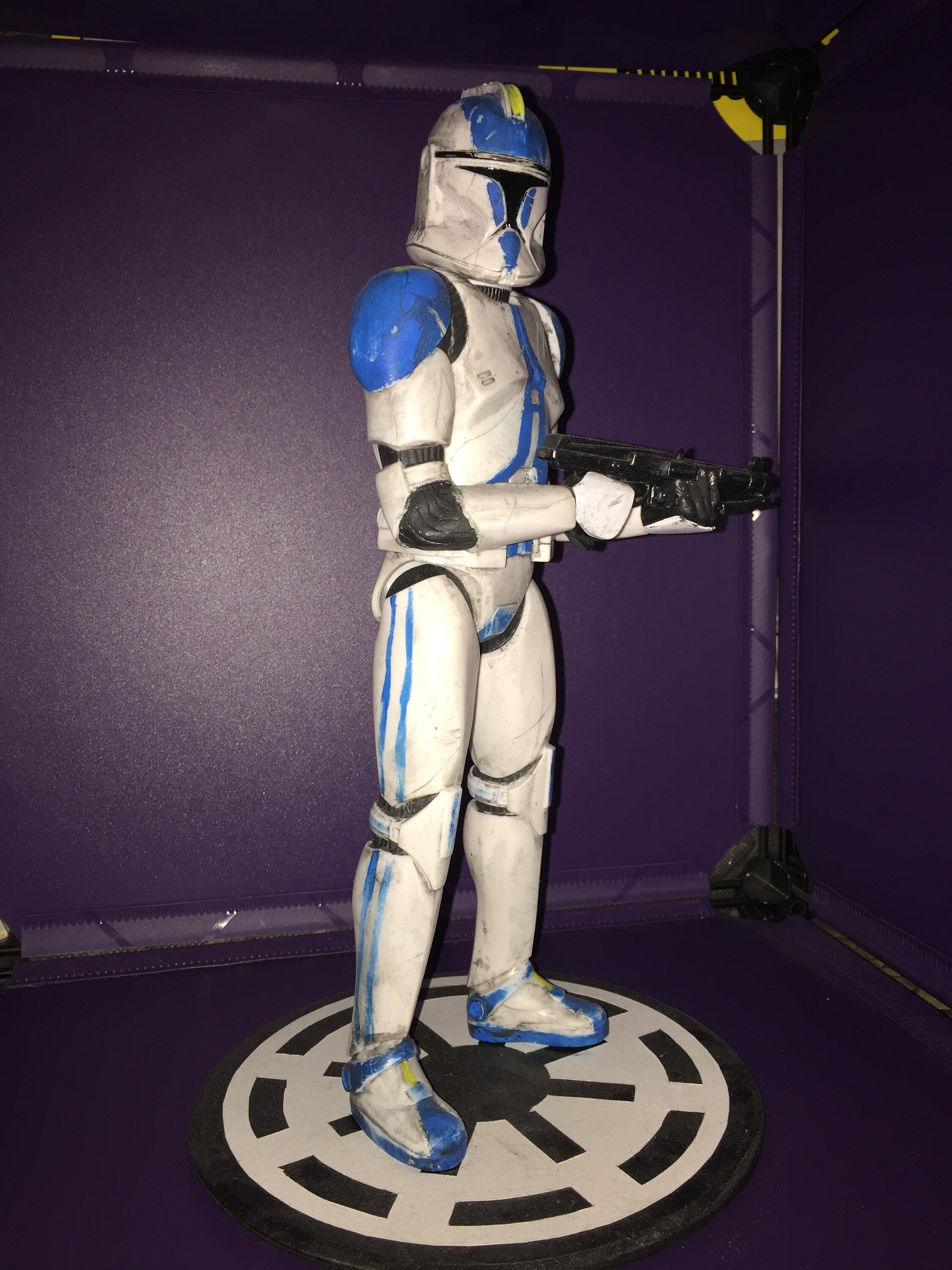 Custom posed and painted clone trooper figure. Starting with a 12 inch hasbro clone trooper figure. Cut and repositioned his elbows to give him a more interesting Pose. Then adding a custom paint scheme as many of the clone troopers did to set them apart from there many brothers. Lastly weathered his armor to give him a realistic and live in look as everything in the Star Wars universe is.